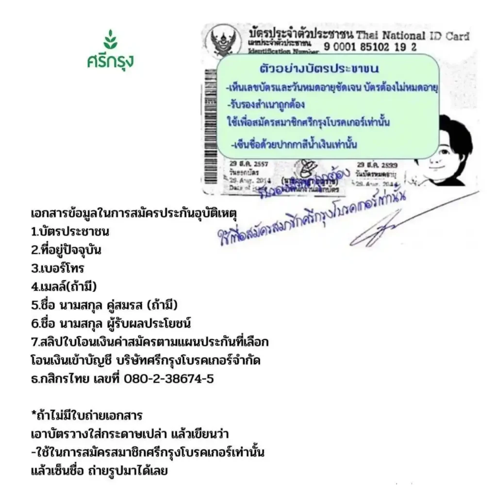 หรือเพียงแค่นำบัตรประชาชนวางบนกระดาษสีขาว เขียนคำว่า “สำหรับใช้สมัครสมาชิกศรีกรุงโบรคเกอร์เท่านั้น”